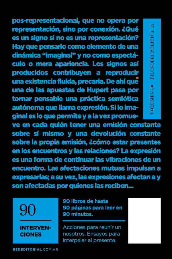 Este libro ensaya dos tesis simultáneas: las imágenes contemporáneas no son representaciones, y tienen una dinámica de dominación. Hupert propone pensar “signos imaginales” como datos y “metadata” producidos por el afán de existir… es decir, existir para los demás. No sólo la existencia, también la producción de subjetividad y objetividad se realiza con signos, y esos signos hoy –tiempos fluidos– son imágenes (publicitarias o mediáticas o de redes sociales que hacen ser a algo o a alguien). Este libro busca hacer pensable la cesura que divide una semiosis sólida o representacional de una semiosis fluida o pos-representacional, que no opera…